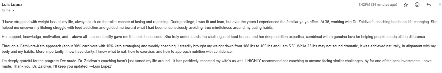 Dr. Zaldivar’s notes on this success story (September 2025): Since then, Luis added in sprinting and higher intensity strength training and some primal carbs (honey, fruits, cottage cheese) to turbocharge his training and keep leveling up his BASELINE dopamine levels, and we were able to reverse his sleep disturbances and electrolyte imbalances that happen on a strict carvnivore diet. Yet another success story added, and Luis and I are very happy.