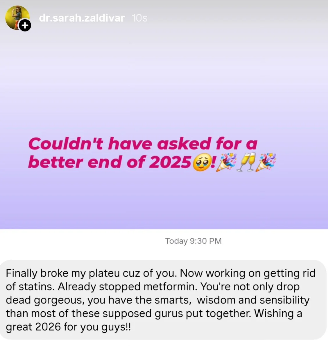 “I felt so lost, constantly repeating the usual “move more, eat less” led me to chasing my calories with exercise, my immune system attacking my extremities and my skin a mess - I kept falling flat on my face each time and getting sicker by the day. @dr.sarah.zaldivar taught me so much about health and nutrition - it’s not calories , it’s what we’re eating and our habits and behaviors around food. So grateful for your energy and shining your light on my journey!!!!.”